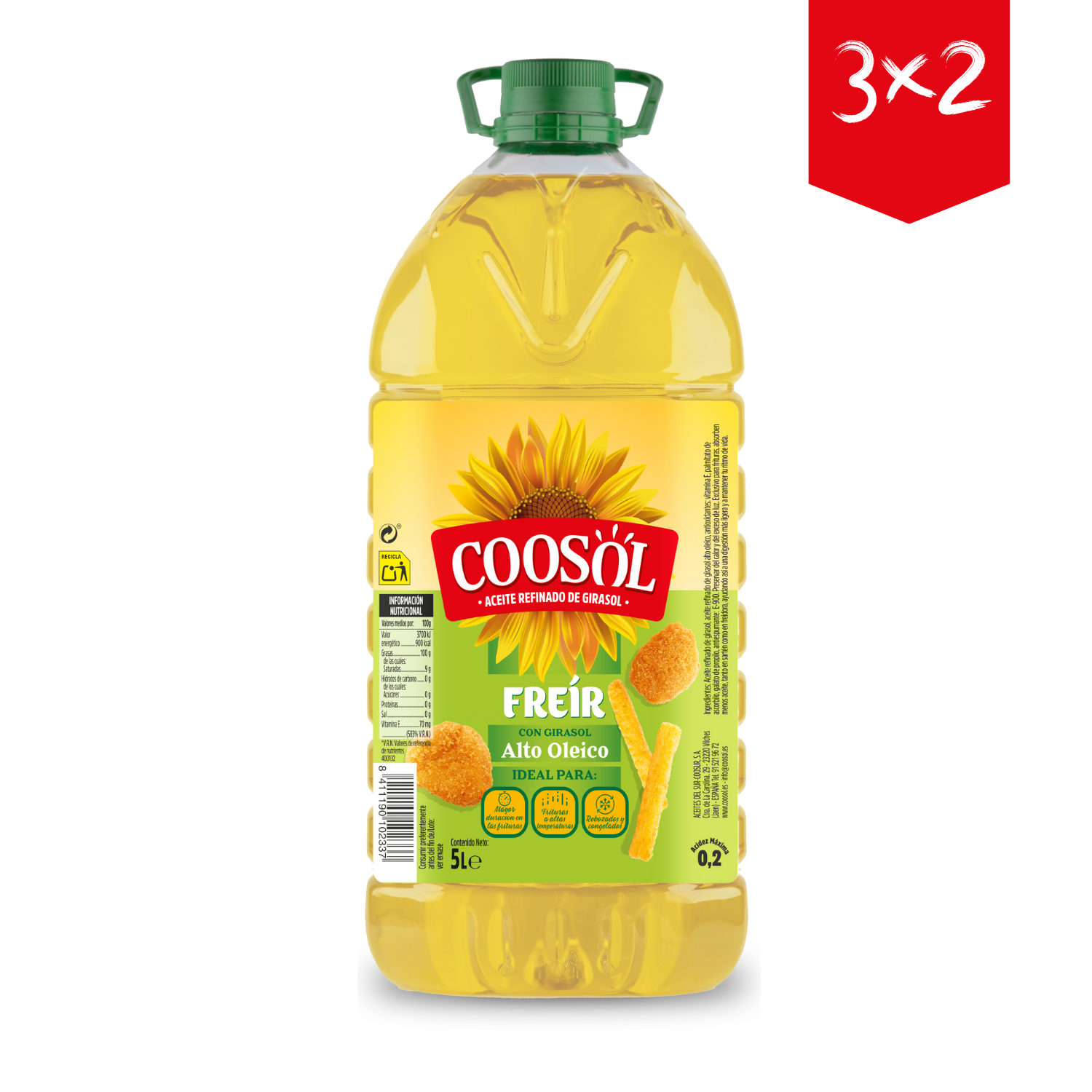 El Aceite de girasol Coosol Especial Freír es un aceite refinado de color amarillo intenso, obtenido de una cuidadosa selección de pipas de girasol alto oleico. Su riqueza en antioxidantes naturales como la vitamina E, lo convierte en una excelente opción para quienes buscan un aceite saludable y de alta calidad para freír.